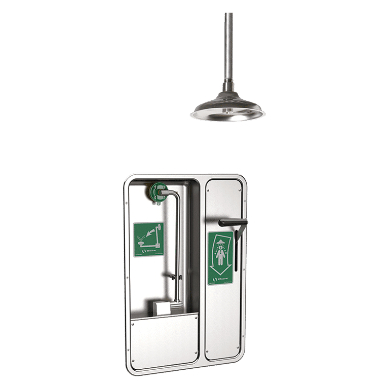 The Haws® 8356WCC AXION is a combined safety shower with ceiling-mounted body shower, stainless steel housing, and space-saving concealed eye wash with drain pan. It was specially designed for laboratories, corridors, and narrow passageways—anywhere where space is limited.